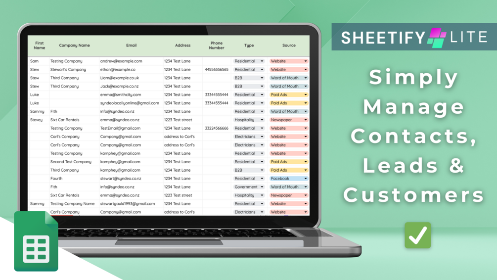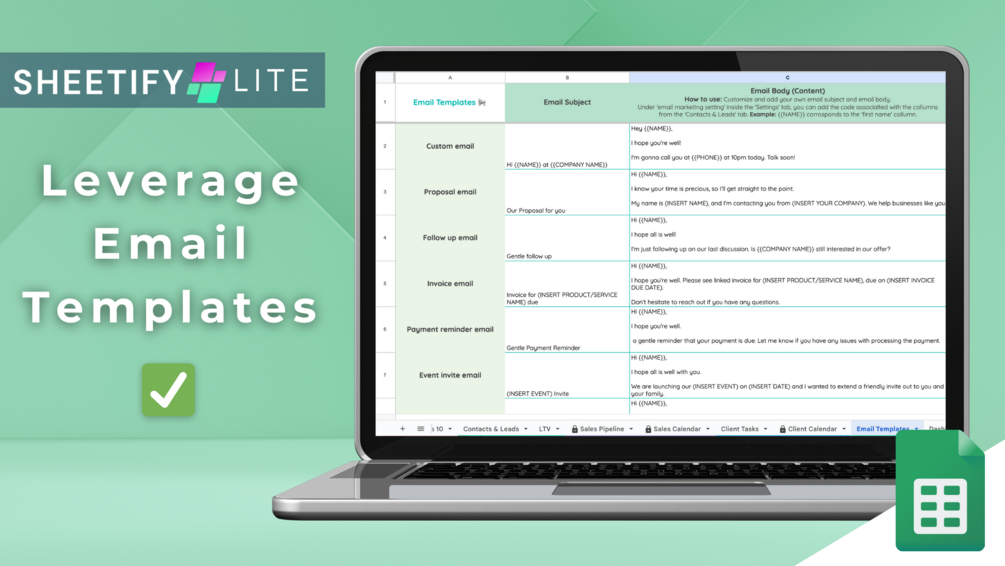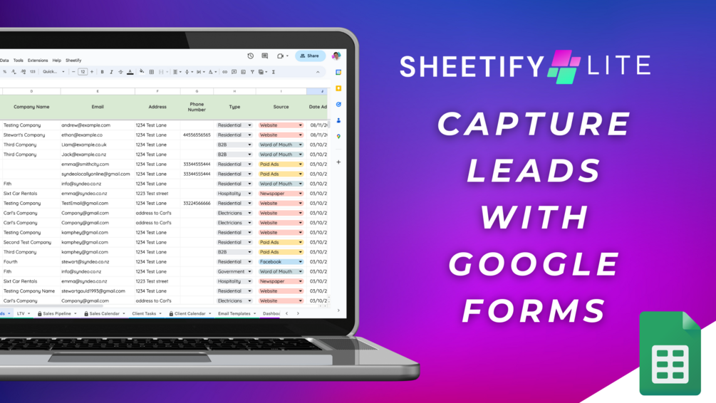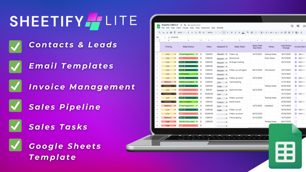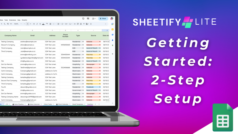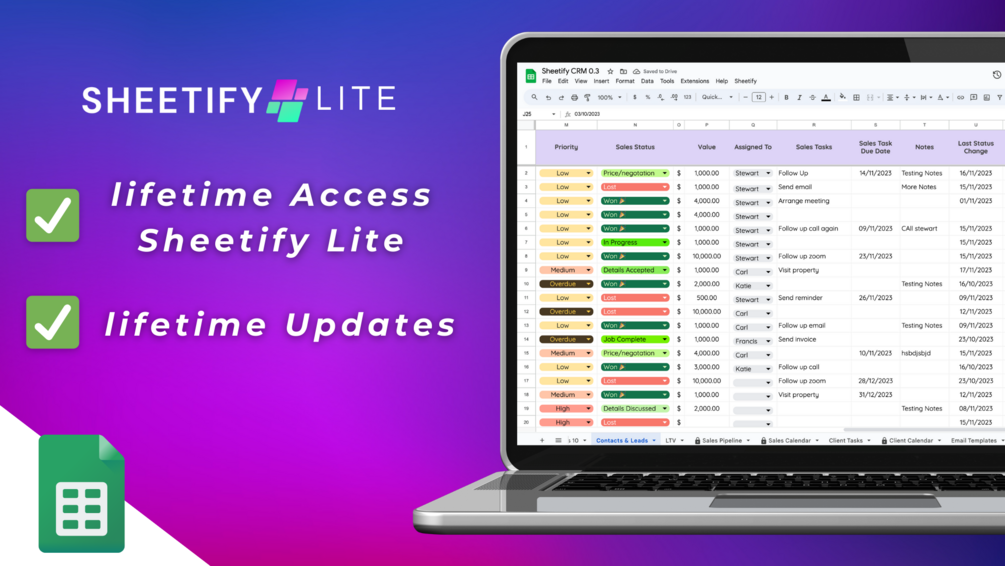 The Sheetify Lite Google Sheets Client Tracker template allows business owners to get the most out of Google Sheets to manage contacts, leads, customers and sales tasks.