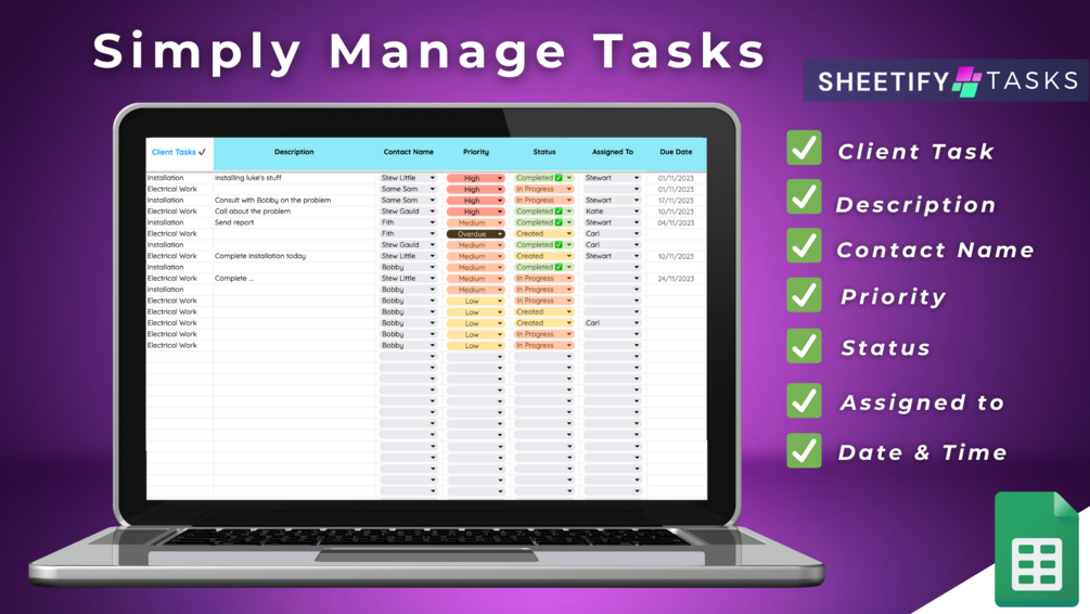 Sheetify - Task Tracker integrates directly with the Google Tasks app, meaning you can manage both your sales, client and recurring tasks in Sheetify and in the mobile app or desktop app! How cool right?